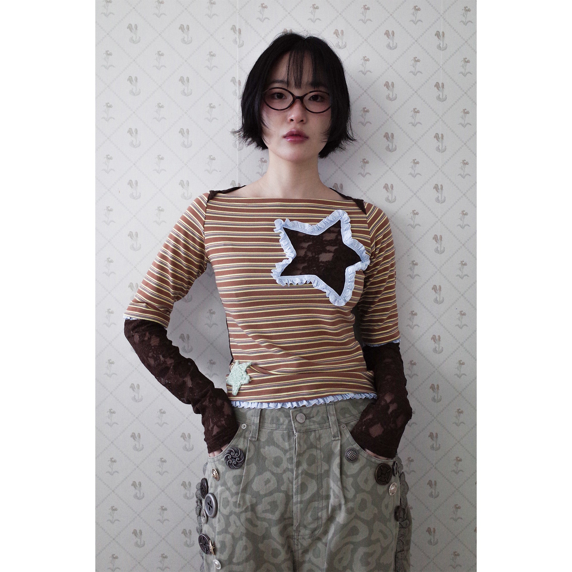 Collaged stripe star top brown