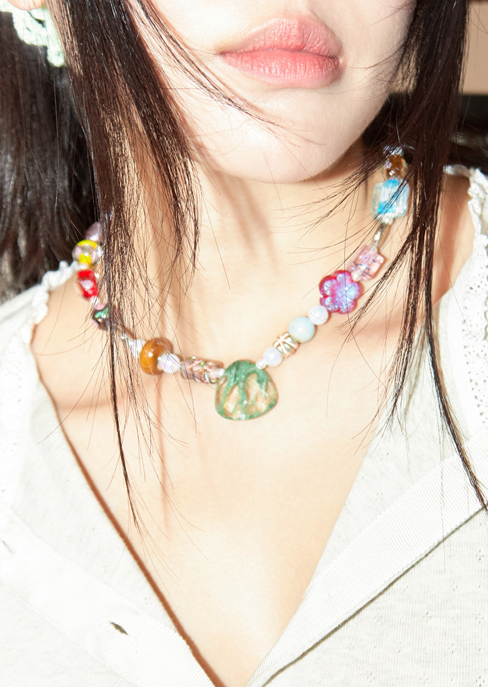 - 유리를 주로 하는 다양한 디자인과 컬러의 비즈들이 빛을 받으면 선 캐쳐 처럼 반짝이는 목걸이입니다,