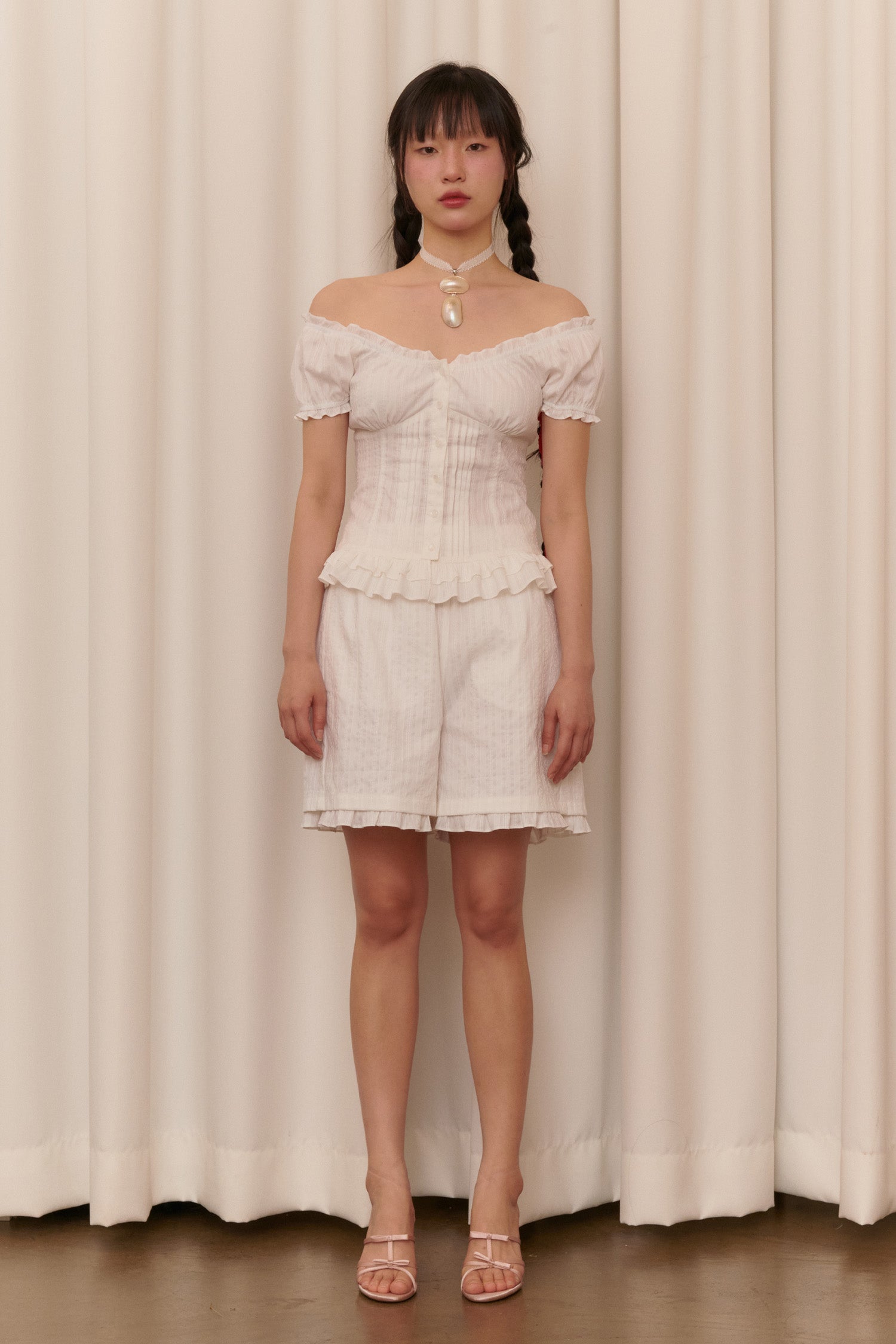 - 밑단 셔링 포인트로 로맨틱하고 코티지한 느낌의 디자인.