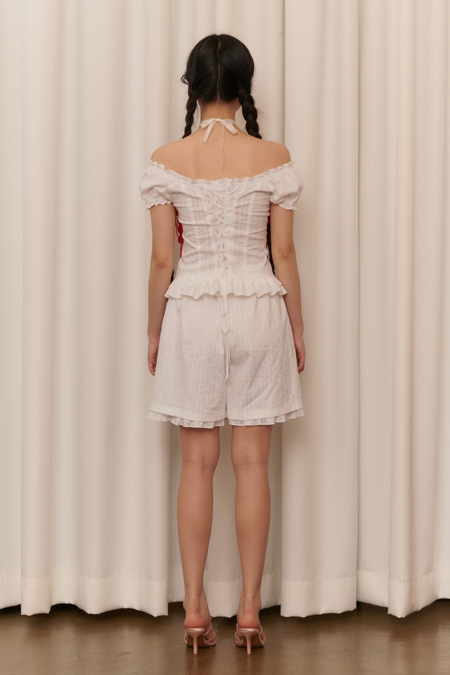 - 같은 소재의 블라우스와 함께 착용하여 더욱 로맨틱하고 코티지한 느낌을 연출 할 수 있음